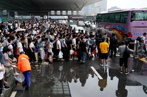기록적인 폭우로 160대 이상의 열차가 정저우 동역에서 운행이 중단되어 많은 승객의 발이 묶였다. 발이 묶인 승객들이 정저우 동역에서 버스에 탑승하기 위해 줄을 서고 있다.