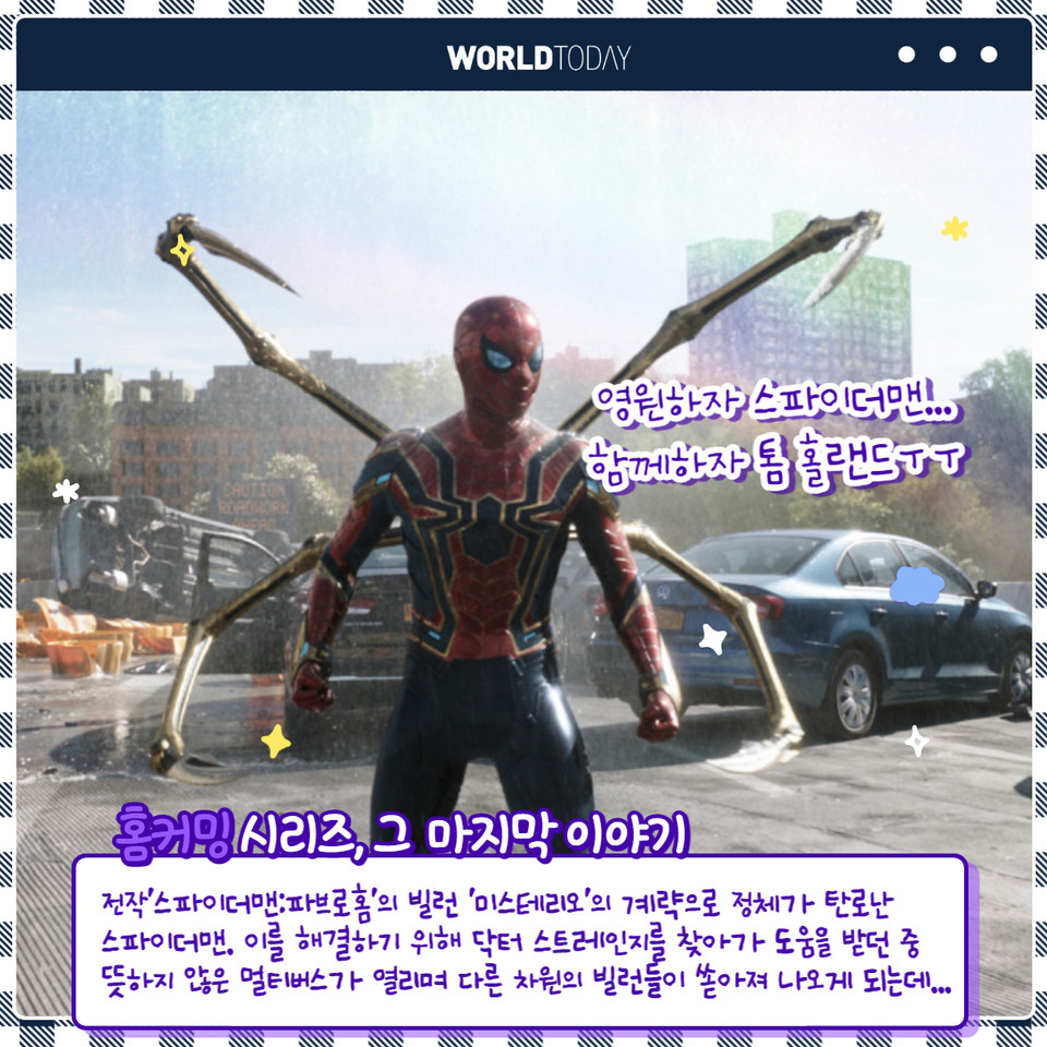 [월드투데이 박한나 기자] wow지수로 알아보는 스파이더맨 리뷰를 살펴보자. 관련기사 [WOW지수로 보는 리뷰] 편협한 선악의 잣대가 만들어낸 디스토피아, 넷플릭스 오리지널 '지옥' [WOW지수로 보는 리뷰] 디즈니, 사랑스러움이 이내 폭발하다!...영화 '엔칸토:마법의 세계' [종합] '스파이더맨: 노 웨이 홈' 톰 홀랜드-손흥민, 젠데이아-정호연 조합 다시 주목? 키워드 #스파이더맨 #스파이더맨홈커밍 #스파이더맨노웨이홈 #wow지수로보는리뷰 #리뷰 #W리뷰 박한나 기자 hanna@mhnew.com 다른기사 보기 저작권자 © 월드투데이 무단전재 및 재배포 금지 댓글삭제 삭제한 댓글은 다시 복구할 수 없습니다. 그래도 삭제하시겠습니까? 비밀번호 닫기 기사 댓글 0 댓글 접기 댓글 내용입력 비회원 로그인 이름 비밀번호 댓글 내용입력 댓글쓰기 계정을 선택하시면 로그인·계정인증을 통해 댓글을 남기실 수 있습니다. 회원 로그인 비회원 글쓰기 이름 비밀번호 자동등록방지 로그인 옵션 창닫기
