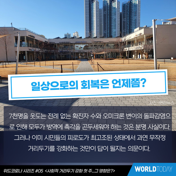 [월드투데이 신서연 기자] 오미크론 변이 등에 따른 일일 확진자 수 7천명 돌파로 정부는 지난 19일부터 사회적 거리두기를 강화했다. 거리두기 강화에 따른 변화들을 알아본다.