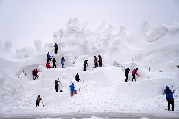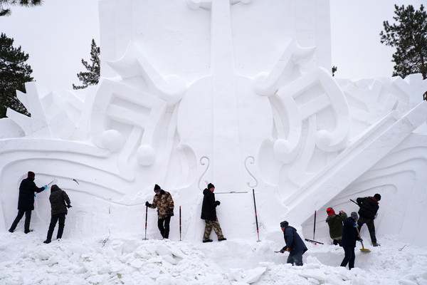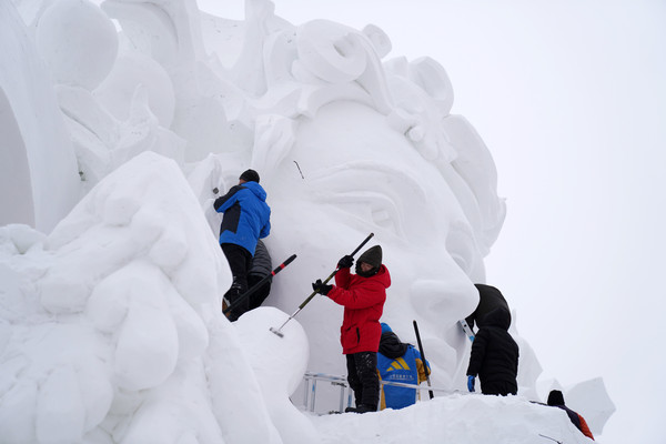 [세계는 지금 - 중국] 눈 조각가들이 2020년 12월 10일 중국 헤이룽장성 북동부 하얼빈에서 열린 제33회 하얼빈 타이양섬 국제 눈 조각 예술 박람회에서 작품을 제작하고 있다. 이 행사는 12월 중후반에 열릴 예정이다.