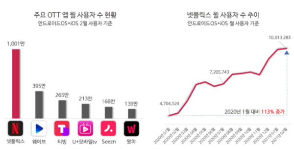 모바일 데이터 기업 아이지에이웍스 조사 결과에 따르면, 유튜브를 OTT 서비스에서 제외한 결과 사용자 수 1위는 넷플릭스다. 넷플릭스는 압도적인 1위로, 전년 1월 대비 이용자 수는 두 배 이상 증가해 천만 이용자를 확보하고 있다.