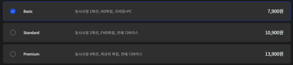 베이직은 동시 접속 시청 1인, 스탠다드는 2인, 프리미엄은 4인까지 이용이 가능하며 각 요금제별 화질에 차이를 둔다.