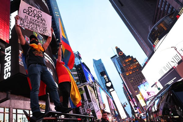 NEW YORK, NEW YORK - MAY 06: A person waves the flag of Colombia as people gather for a rally in support of Colombian protestors in Times Square in Midtown Manhattan on May 06, 2021 in New York City. Nineteen people were killed and hundreds injured as people took to the streets across Colombia in the last few days to protest against a proposed tax increase meant to offset a pandemic-related fiscal decline in the country. On Sunday, President Ivan Duque announced that he was withdrawing the proposal and would come up with a new solution. Protesters in the country have now turned their focus on rising poverty, unemployment and inequality which all became worse due to the coronavirus (COVID-19) pandemic. Michael M. Santiago/Getty Images/AFP