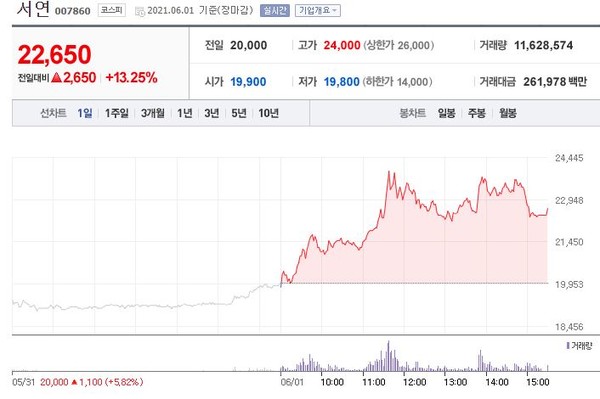 서연은 전일대비 13.25%(2650원) 상승한 22,650원에 장을 마감했다.