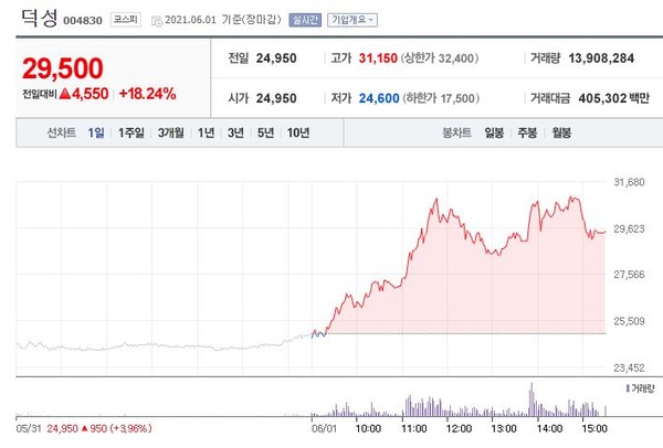 덕성은 전일대비 18.24%(4550원) 상승한 29,500원에 장을 마감했다.