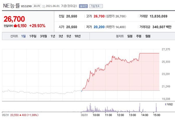 NE능률은 오후 2시께 상한가를 달성했다. 주가는 전일대비 29.93%(6,150원) 상승한 26,700원에 거래를 마쳤다.