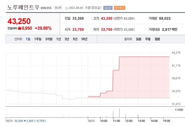노루페인트우(090355)는 오전 11시부터 급등해 11시30분께 상한가를 달성했다. 주가는 전일대비 29.88%(9,950원) 상승한 43,250원에 거래를 마쳤다. 현재 투자경고 종목으로 지정된 상태다.