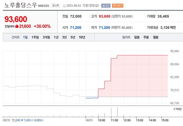 노루홀딩스우(000325)는 오전 10시부터 상승해 11시 30분 가격제한폭까지 올라 전일대비 30%(21,600원) 상승한 93,600원에 장을 마쳤다. 역시 투자경고 종목으로 지정됐다.