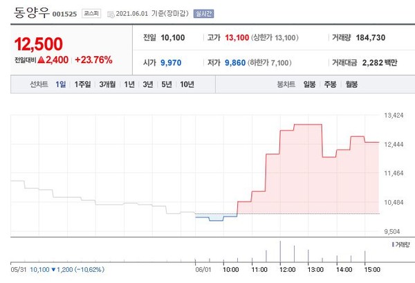 주가는 12시께 가격제한폭인 13,100원까지 올랐으나 등락을 거쳐 전일대비 23.76%(2400원) 상승한 12,500원에 장을 마쳤다.