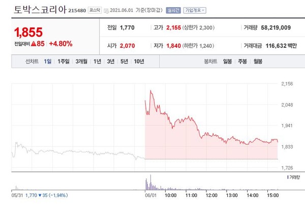 토박스코리아는 이날 장초반 상한가 목전인 2,155원까지 상승했으나 하락해 전일대비 4.80%(85원) 오른 1,855원에 장을 마쳤다.