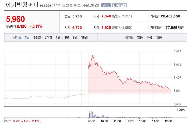 아가방컴퍼니(013990)는 장 초반 7340원까지 상승 후 하락해 전일대비 3.11%(180원) 상승한 5,960원에 장을 마감했다.
