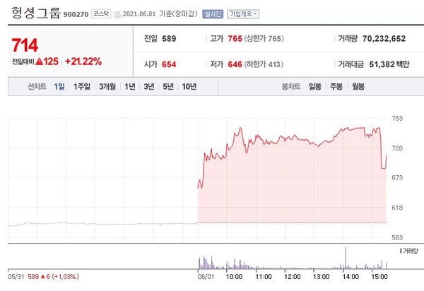 주가는 가격제한폭인 765원까지 올랐으나 장 마감 직전 급락해 전일대비 21.22%(125원) 상승한 714원에 거래를 마쳤다.