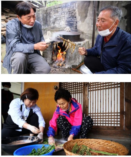 솥에서 어탕이 끓을때면 아궁이불에는 꼬챙이에 끼운 산메기며, 중태를 구워 먹곤 했다. 마을에서 재배한 산양삼을 넣어 끓인 어탕국수는 여름맞이 보양식으로 일품. 가죽나물에 양념한 찹쌀풀을 발라 말린후 기름에 튀겨먹는 가죽자반과 고추씨를 발라내고 밀가루를 입혀 구운 고추부적은 입맛을 점점 사라지는 마을의 옛 음식들.