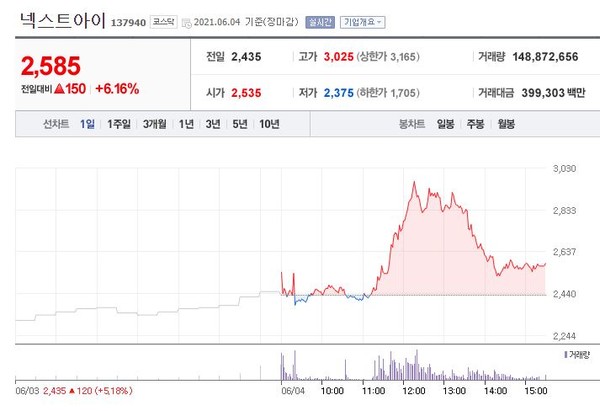 넥스트아이(137940)는 3거래일 연속 상승세를 유지했다. 이날 주가는 전일대비 6.16%(150원) 상승한 2,585원에 장을 마쳤다.