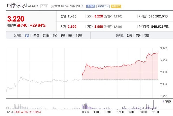 대한전선은 장중 가격제한폭까지 오르며 전일대비 29.84%(740원) 상승한 3,220원에 장을 마쳤다.