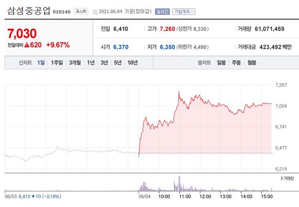 삼성중공업은 전일대비 9.67%(602원) 상승한 7,030원에 거래를 마쳤다.