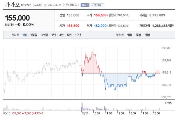 이날 카카오는 장 초반 15만9천원 선을 터치하고 등락해 155,000원으로 보합 마감했다.