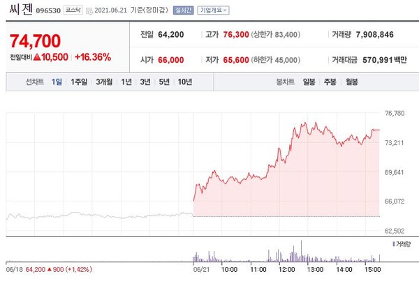 씨젠은 전일대비 16.36%(10,500원) 상승한 74,700원에 거래를 마쳤다.