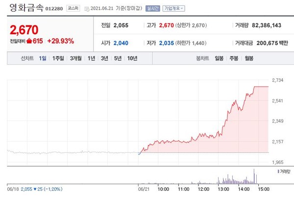 영화금속은 상한가를 달성했다. 주가는 오후부터 급등해 전일대비 29.93%(615원) 상승한 2,670원에 장을 마감했다.