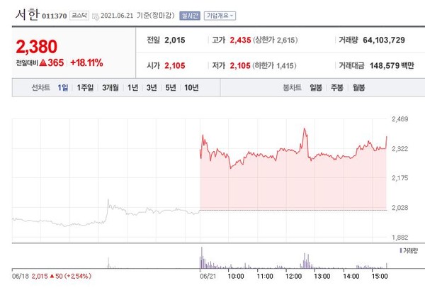 서한도 상승했다. 주가는 전일대비 18.11%(365원) 오른 2,380원에 거래를 마쳤다.