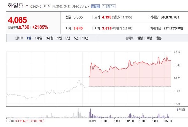 주가는 전일대비 21.89%(730원) 상승한 4,065원에 장을 마감했다.