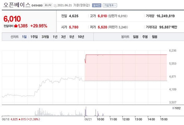 주가는 장 시작과 동시에 급등해 전일대비 29.95%(1,385원) 상승한 6,010원에 거래를 마쳤다.