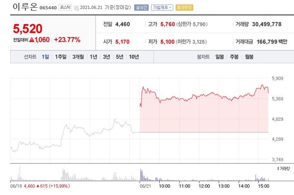주가는 장중 5천670원을 터치하고 소폭 하락해 전일대비 23.77%(1,060원) 오른 5,520원에 장을 마쳤다. 현재 한국거래소 투자주의 종목으로 지정된 상태다.