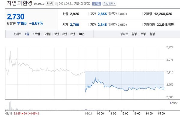 지난주 상한가를 달성했던 자연과환경은 이날 전일대비 6.67%(195원) 하락한 2,730원에 장을 마쳤다.