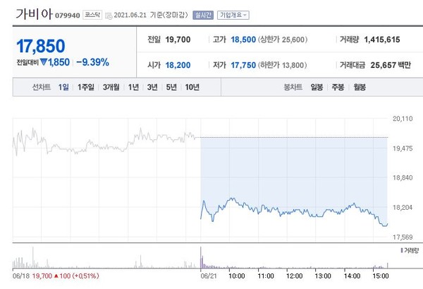 가비아는 전일대비 9.39%(1,850원) 하락한 17,850원에 장을 마쳤다.