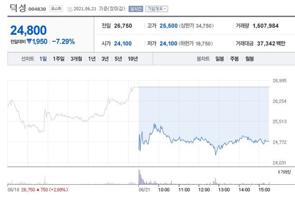 덕성은 전일대비 7.29%(1,950원) 하락한 24,800원에 장을 마쳤다.