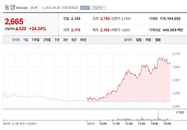 동양은 전일대비 24.24%(520원) 상승한 2,665원에 거래를 마쳤다.