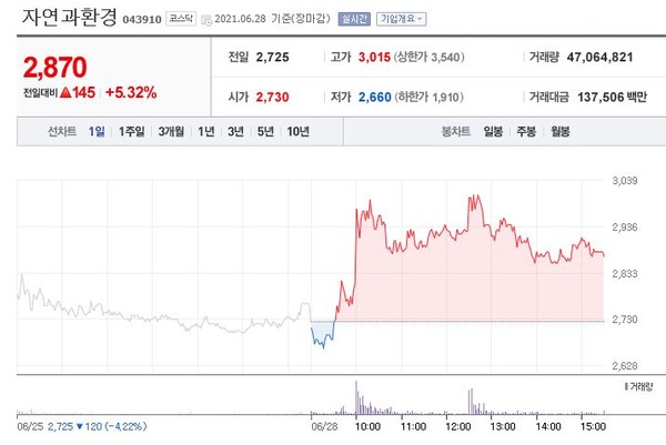 주가는 3,150원을 터치한 후 하락해 전일대비 5.32%(145원) 상승한 2,870원에 장을 마쳤다.