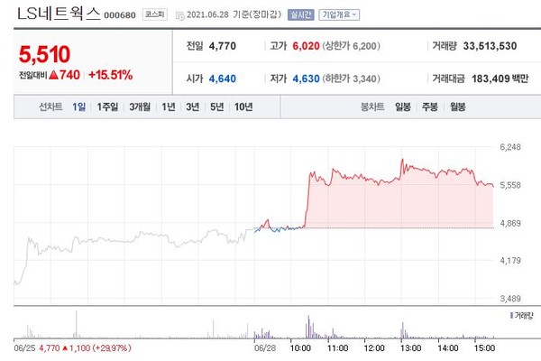 주가는 전일대비 15.51%(740원) 5,510원에 장을 마쳤다.