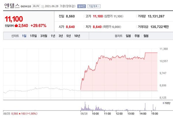 엔텔스는 '메타버스' 테마로 분류되는데, 이재명 경기도지사가 메타버스를 활용한 소통을 언급하며 매수세가 몰린 것으로 풀이된다.