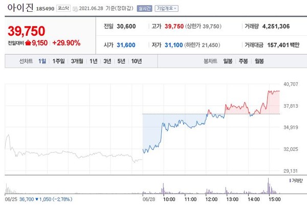 장 초반 하락하던 아이진은 오후 1시께부터 반등해 가격제한폭까지 치솟았다. 전일대비 20.90%(9,150원) 상승한 39,750원에 장을 마쳤다.