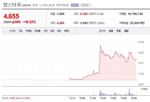 맘스터치는 오후 12시께부터 급등해 상한가 목전이 5180원을 터치했다. 이후 등락을 거쳐 전일대비 16.52%(660원) 상승한 4,655원에 장을 마감했다.