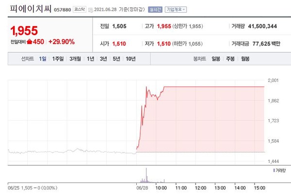 피에이치씨는 전일대비 29.90%(450원) 상승한 1,955원에 장을 마감했다.