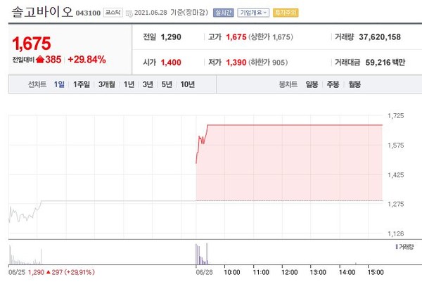 솔고바이오는 장 초반 가격제한폭까지 오르며 전일대비 29.84%(385원) 상승한 1,675원에 거래를 마쳤다.