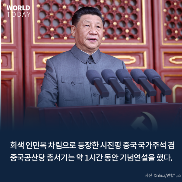 회색 인민복 차림으로 등장한 시진핑 중국 국가주석 겸 중국공산당 총서기는 약 1시간 동안 기념연설을 했다.