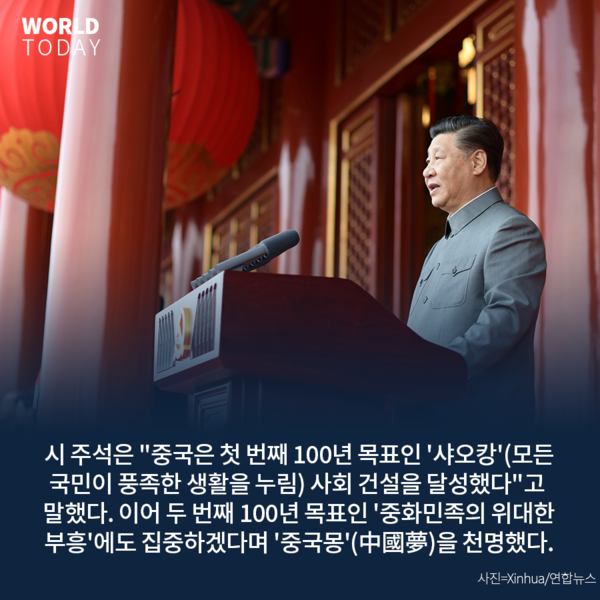 이날 시 주석은 "중국은 첫 번째 100년 목표인 '샤오캉'(모든 국민이 풍족한 생활을 누림) 사회 건설을 달성했다"고 말했다. 이어 두 번째 100년 목표인 '중화민족의 위대한 부흥'에도 집중하겠다며 '중국몽'(中國夢)을 천명했다.