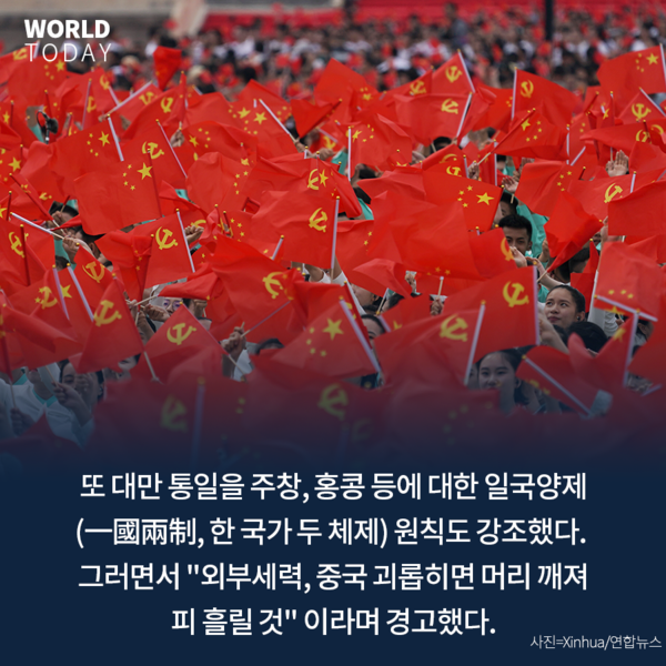 또 대만 통일을 주창, 홍콩 등에 대한 일국양제(一國兩制, 한 국가 두 체제) 원칙도 강조했다. 그러면서 "외부세력, 중국 괴롭히면 머리 깨져 피 흘릴 것"이라며 경고했다.