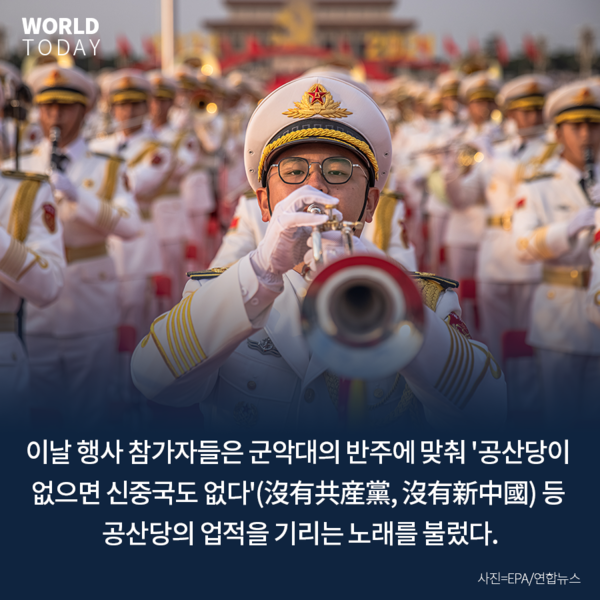 이날 참가자들은 군악대의 반주에 맞춰 '공산당이 없으면 신중국도 없다'(沒有共産黨, 沒有新中國) 등 공산당의 업적을 기리는 노래를 불렀다.