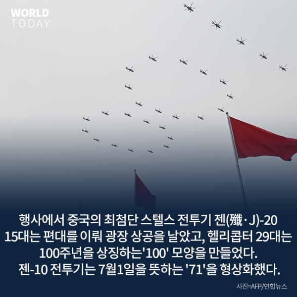 행사에서 중국의 최첨단 스텔스 전투기 젠(殲·J)-20 15대가 편대를 이뤄 광장 상공을 날았고, 헬리콥터 29대는 100주년을 상징하는 숫자 '100' 모양을 만들었다. 젠(殲·J)-10 전투기는 7월1일을 의미하는 '71'을 형상화했다.