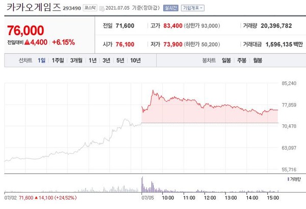 카카오게임즈는 장중 8만3400원을 터치하고 소폭 하락해 전일대비 6.15%(4,400원) 76,000원에 장을 마쳤다.