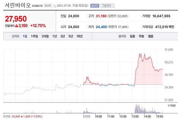 서린바이오는 전일대비 12.70%(3,150원) 상승한 27,950원에 장을 마감했다.
