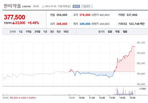 한미약품은 하락세에서 반등해 전일대비 6.49%(23,000원)상승한 377,500원에 장을 마쳤다.