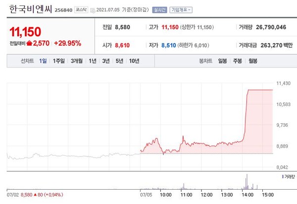 한국비엔씨가 상한가를 달성했다.
