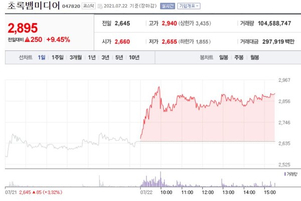 장중 2,940원을 터치한 주가는 등락해 전일대비 9.45%(250원) 상승한 2,895원에 장을 마감했다.