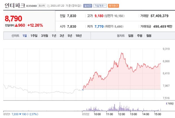 인터파크는 오후12시께 장중 최고가인 9,180원을 터치하고 등락해 전일대비 12.26%(960원) 상승한 8,790원에 장을 마쳤다. 현재 한국거래소 투자경고 종목으로 지정된 상태다.