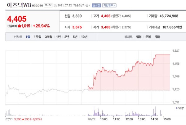 아즈텍WB는 오후2시께를 기점으로 가격제한폭까지 오르며 전일대비 29.94% (1,015원) 상승한 4,405원에 장을 마감했다.